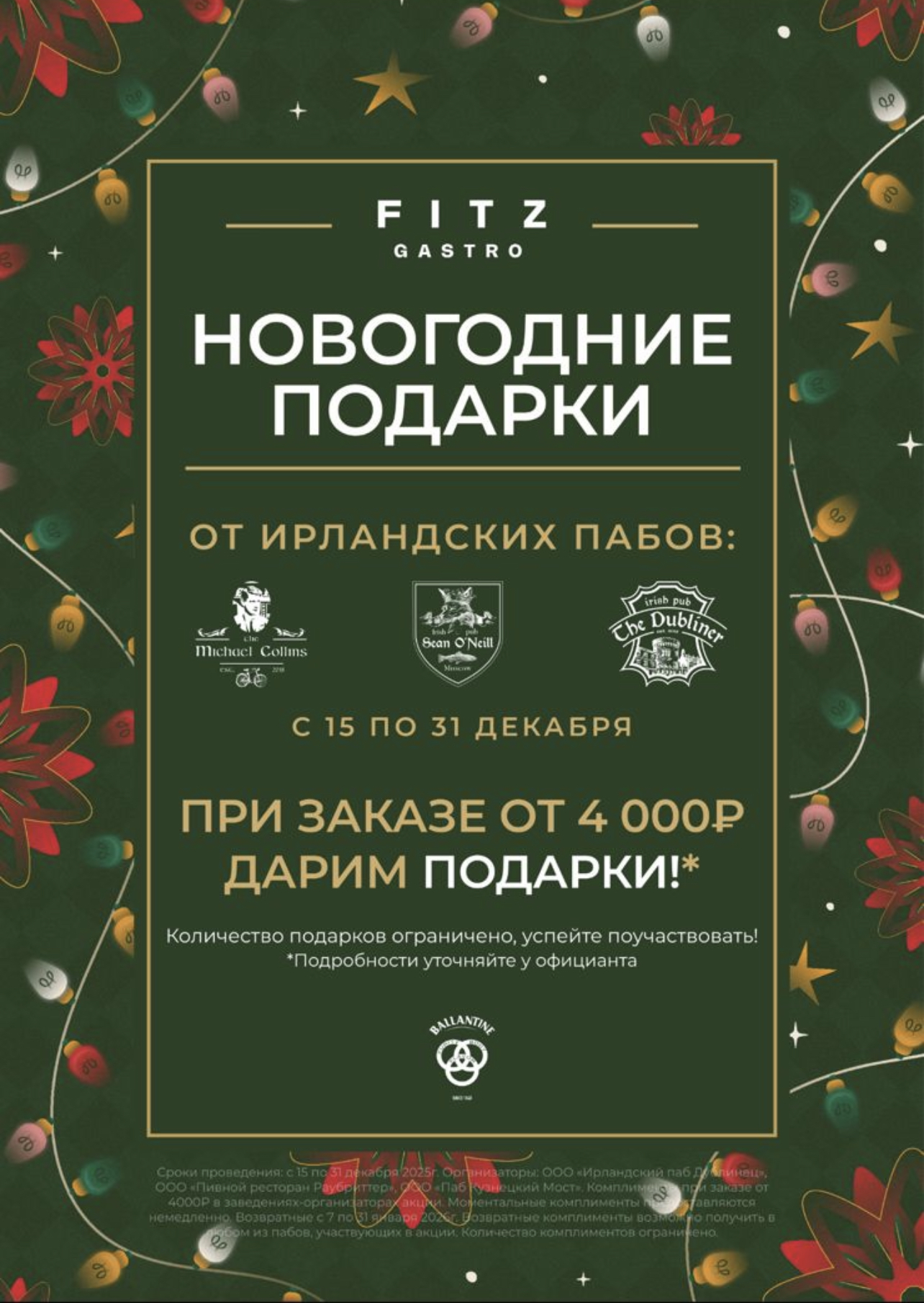 Сроки проведения: с 15 по 31 декабря 2025г. Организаторы: ООО «Ирландский паб Дублинец», ООО «Пивной ресторан Раубриттер», ООО «Паб Кузнецкий Мост». Комплименты при заказе от 4000₽ в заведениях-организаторах акции. Моментальные комплименты предоставляются немедленно. Возвратные с 7 по 31 января 2026г. Возвратные комплименты возможно получить в любом из пабов, участвующих в акции. Количество комплиментов ограничено.